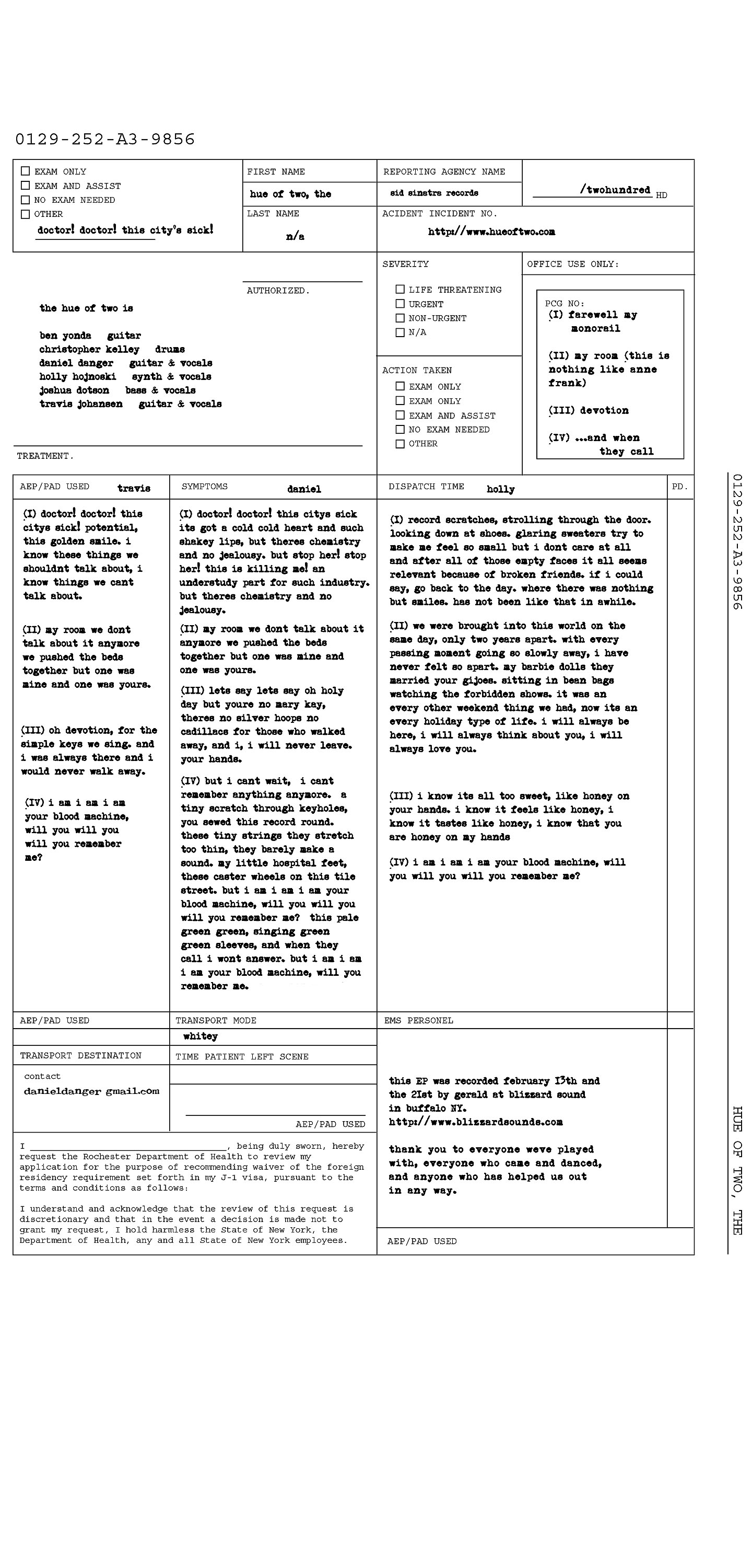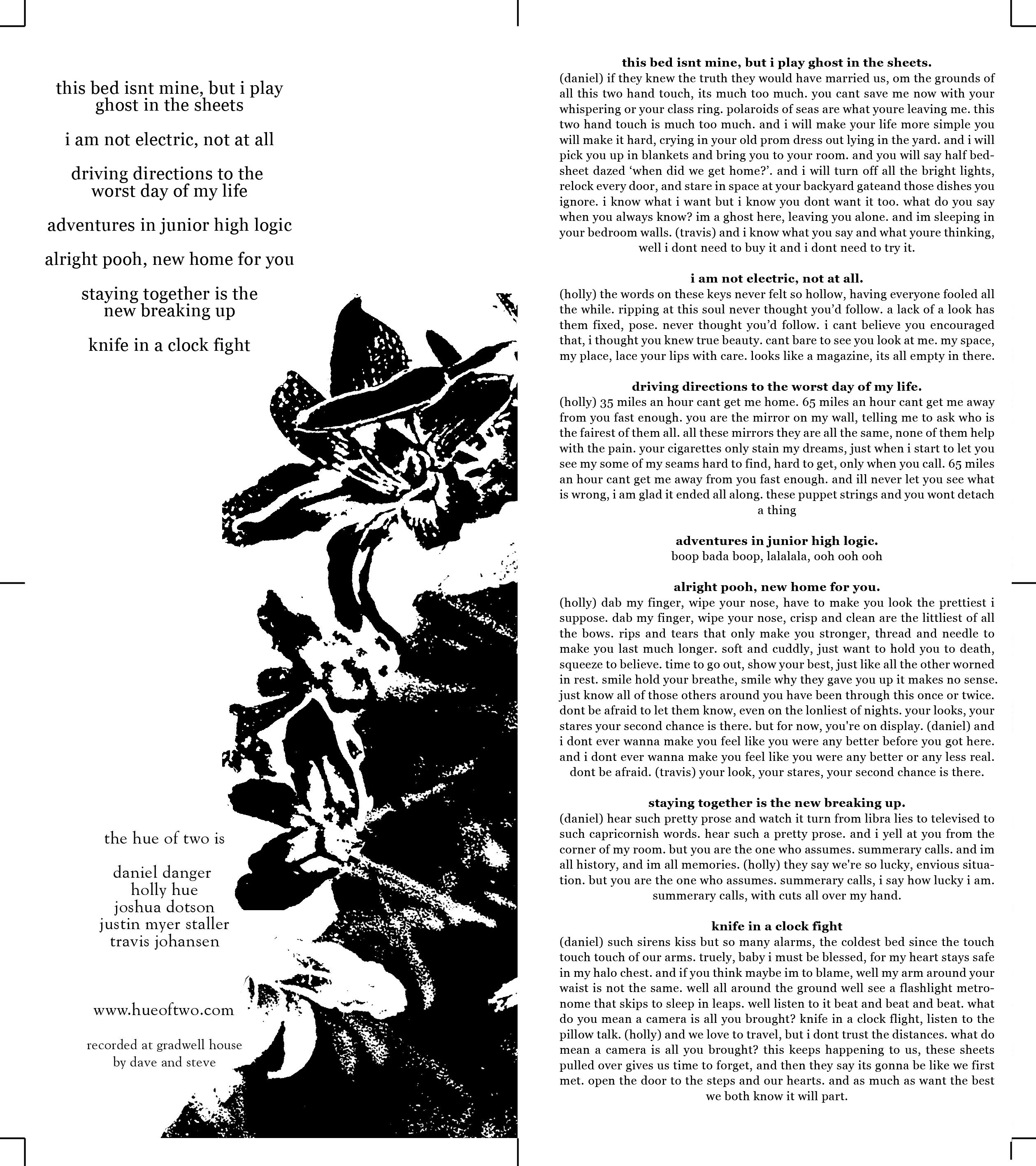 holly joined soon after and we began working on the 3 part vocals that was sort of the hues trademark. that went pretty well. we scrapped some old songs, wrote some new ones and recorded a cd and made ridiculous packaging. it was pretty neat, chris was a mess in the studio though. we ate some pizza too that had really weird tiny pepperonis on it. we played alot of shows, most were a really fun mess. we did a east coast tour that was remarkably not a mess. durring this tour, trav got purposely kicked in the face, ben drank alot, i lost my capo in every city, josh had AMAZING hair and got drunk in the shower, and some stuff happened in NYC that to this day remains secret.